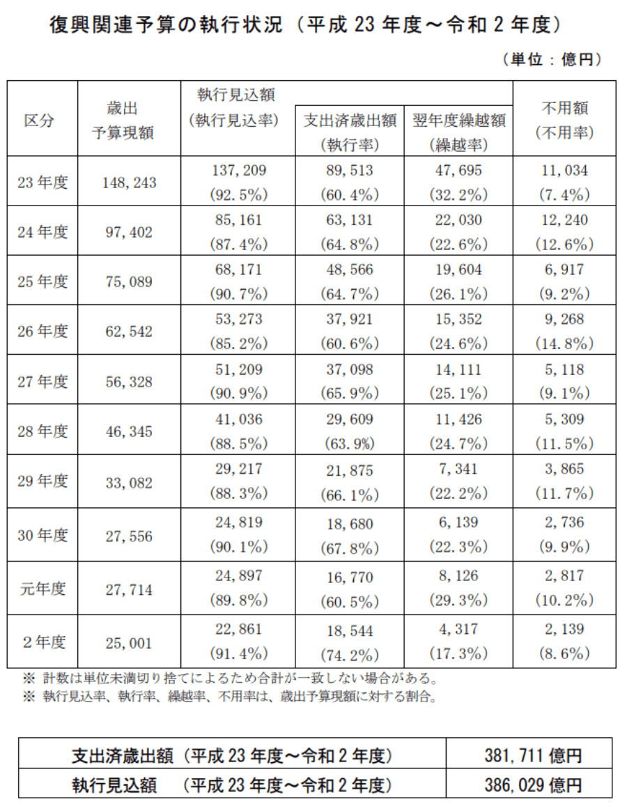 なお、復興関連予算について、「不適切使用等の批判を招くことがないよう、使途の厳格化を行う」こととされた。(第2章第4節2.参照)