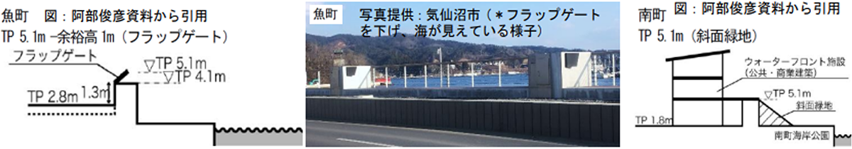 また、気仙沼市内湾地区魚町では、防潮堤の高さをT.P+5.1mとすることを基本とし、余裕高さ1.0m相当のフラップゲート式(可動式)堤防が採用され、まち側の嵩上げを行うことで、海への眺望が確保された。可動式の堤防は他の堤防と比べて高額であったが、中心市街地である内湾地区の経済への影響を考慮し、妥当であると判断され採用された。また、まち側の建物を一斉に壊し、嵩上げ工事の完了を待つことになると建物の再建が遅れ、地権者の負担が増えるため、先行して嵩上げする街区を決め、早期再建を望む土地をそこに集約換地するなどの工夫がなされた。