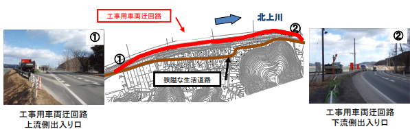 北上川河口部の工事が実施されるにあたり、国土交通省東北地方整備局では、宮城県や石巻市等と連携を図り、工事用大型車両の通行を迂回させ交通事故の防止や地域住民の安全に努めた。その結果、大型車両の約6割が工事用車両迂回路の通行に切り替えられ、生活道路での大型車両通行が大幅に削減された。