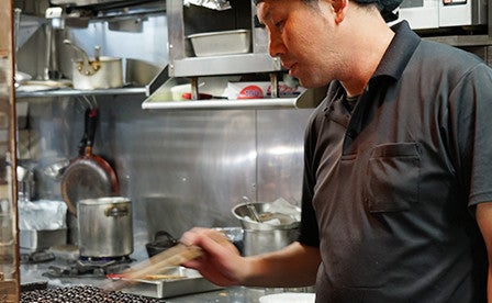 A staff member devotedly grilling beef tongue