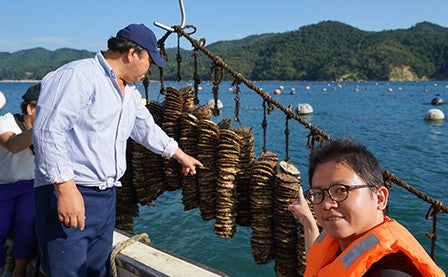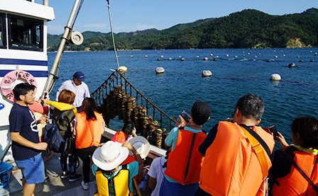 This time I had the special opportunity to participate in a fishing experience on Ishinomaki’s Oshika Peninsula. Participants in this experience get to ride on a local fisherman’s boat, enjoy the view from the boat and also see the various stages of oysters being cultivated.