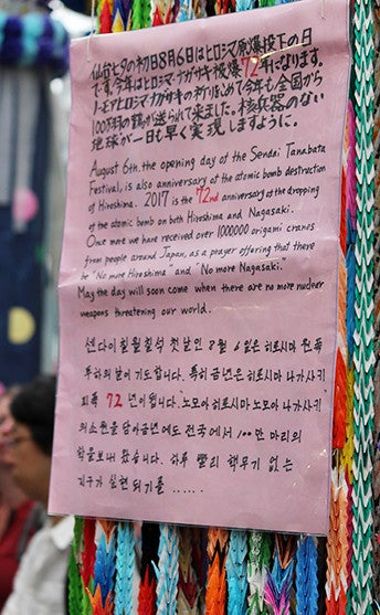 After a little while, I noticed some writing in Korean. The seventh day of the seventh month in the lunar calendar marks the start of Sendai's Tanabata Festival in August, and is also the day that the atomic bomb was dropped on Hiroshima.