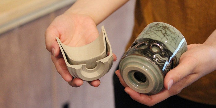 Walking briskly, Kaori approaches with ceramics to show me in each hand.