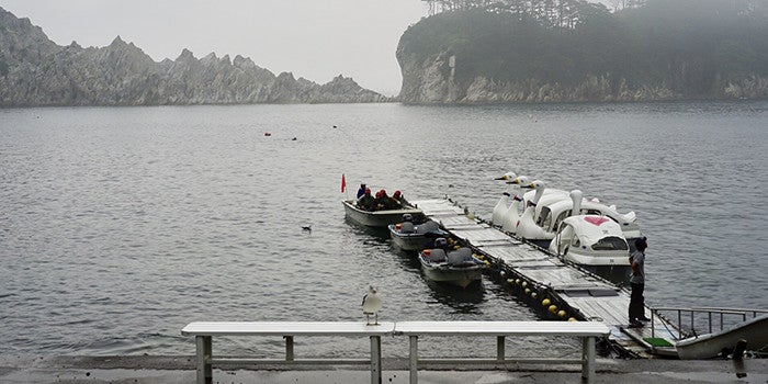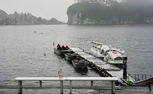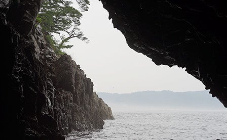At Jodogahama, located along the coast of Sanriku Fukko (Reconstruction) National Park, the verdant pine trees and light grey rocks look attractive against the green sea, forming a beautiful coast that Japanese people refer to as "white sand and green pines." The day we visited was foggy, making it appear all the more magical.