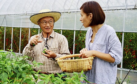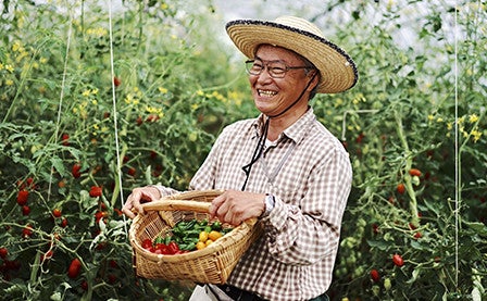 Seeing all the fine tomatoes that had been harvested, Saito-san smiles with joy.