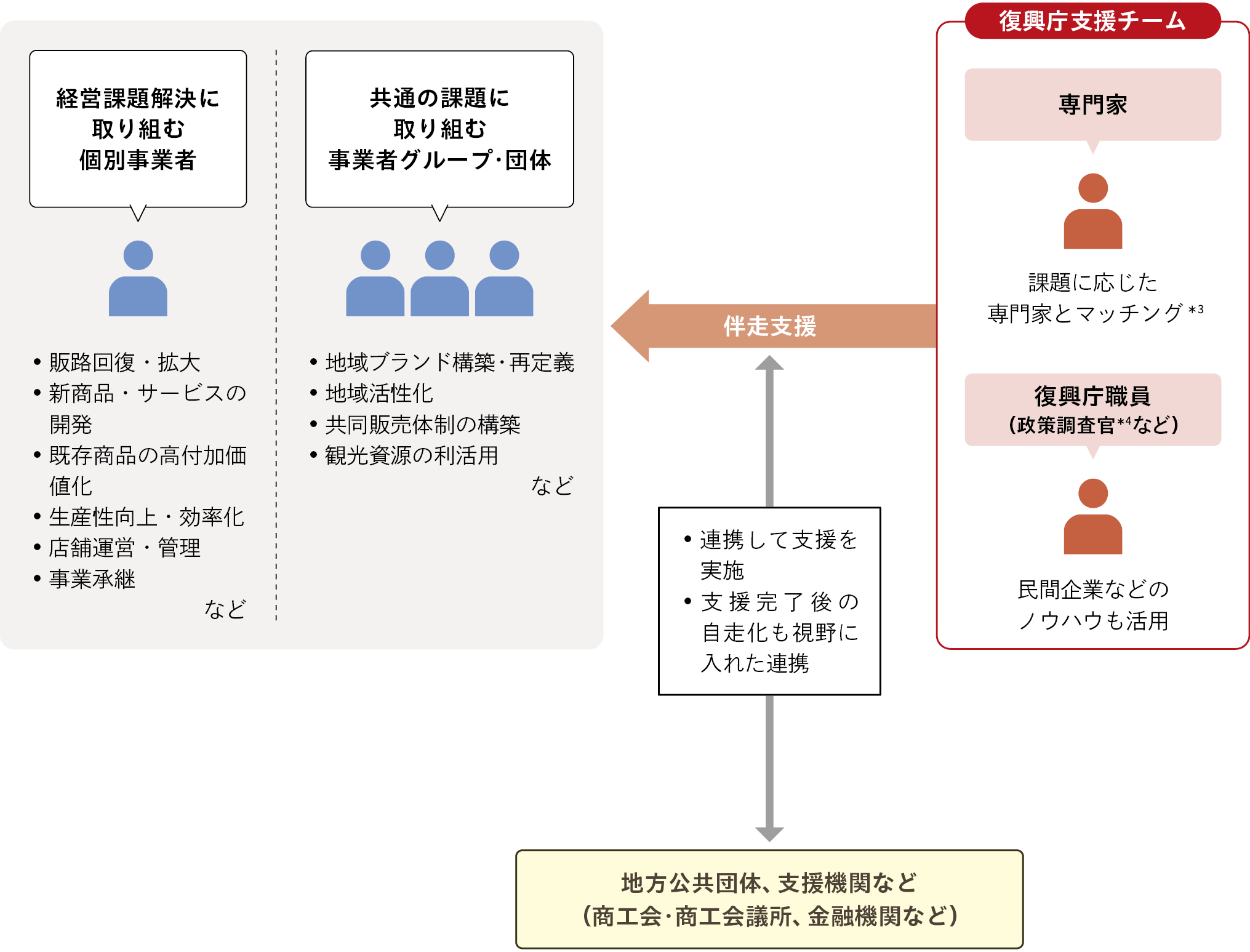 被災地域の事業者*1に専門家*2を派遣し、販路回復・拡大、新商品・サービスの開発、既存商品の高付加価値化、生産性向上・効率化などの経営課題の解決に向け、伴走型で支援する事業です。支援形態としては、個社支援、グループ支援、販路拡大グループ支援の3つの形態があります。​