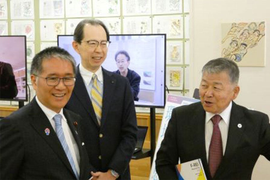 起工式終了後は、2周年記念シンポジウム(主催:F-REI)が、浪江町地域スポーツセンターにて開かれました。シンポジウムでは、山崎F-REI理事長による「福島国際研究教育機構の創造的復興への挑戦」と題した基調講演のほか、関係者等の講演・発表が行われました。会場では、研究の取組が分かる動画・アニメーションの放映のほか、研究紹介のパネル展示も行われ、多くの来場者が、復興に向けた先端的な研究に触れていました。