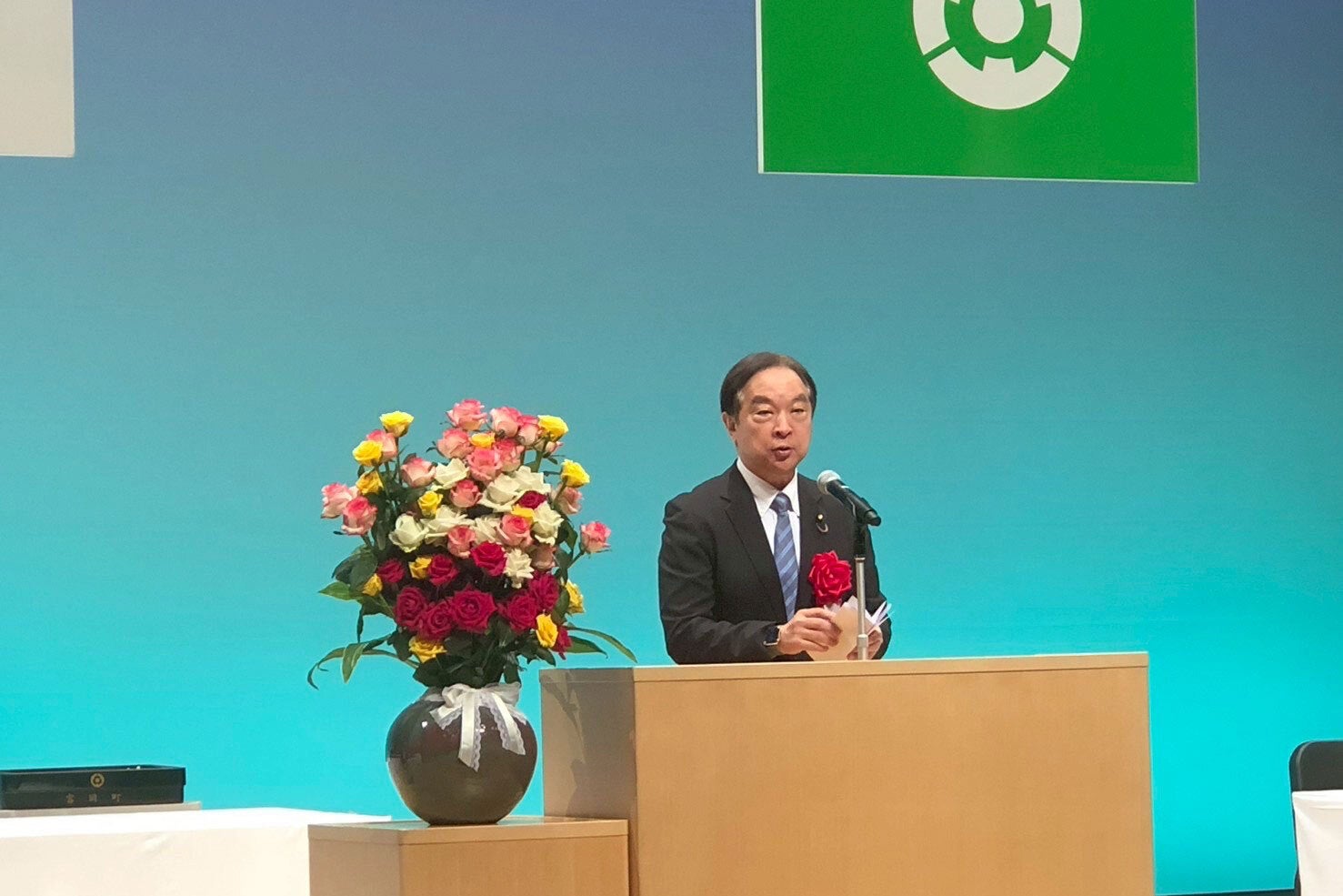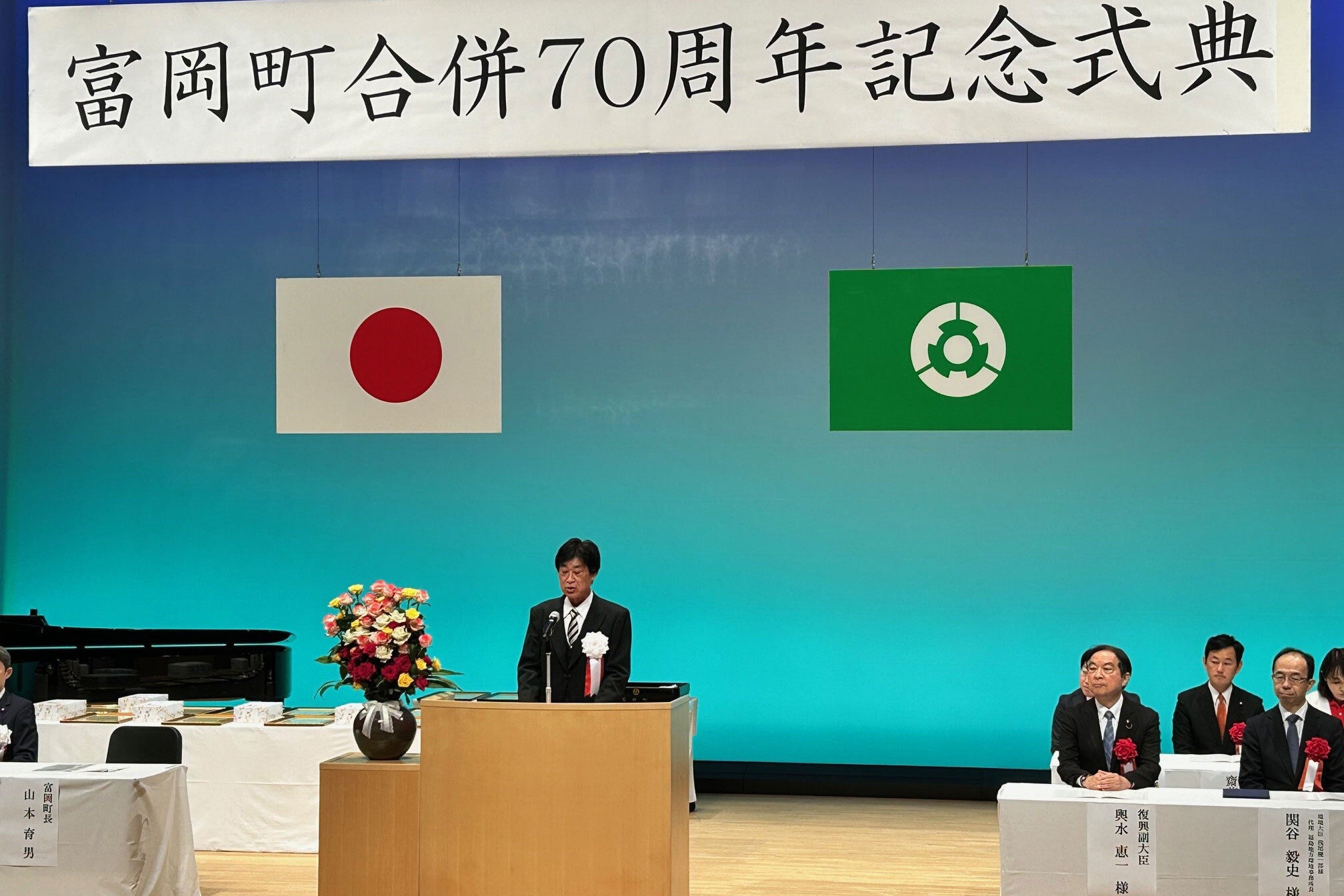 令和7年6月8日(日)、富岡町文化交流センター「学びの森」において、富岡町合併70周年記念式典が富岡町主催で執り行われました。輿水復興副大臣が来賓として出席したほか、国、県、市町村から関係者約170人が出席されました。