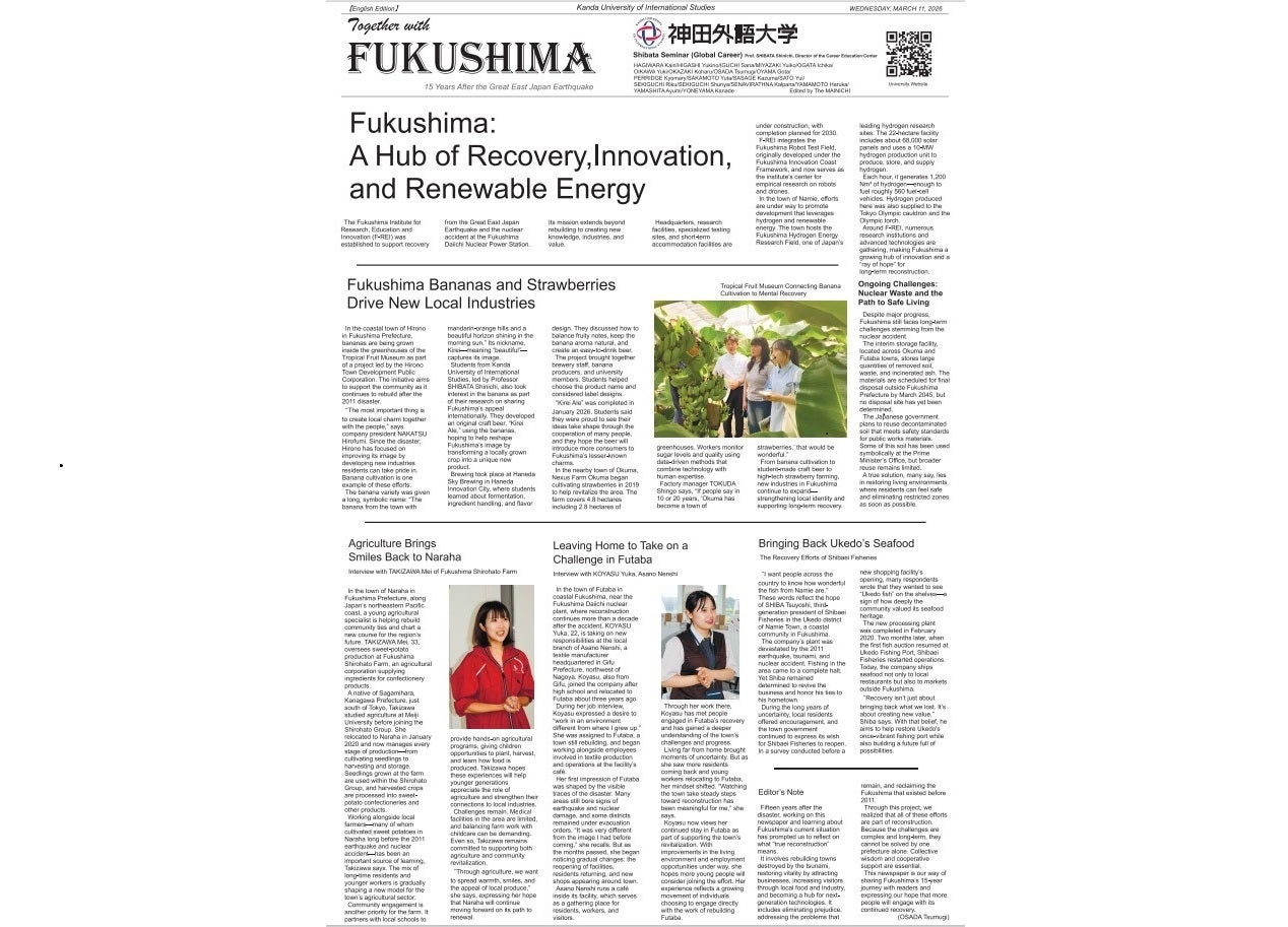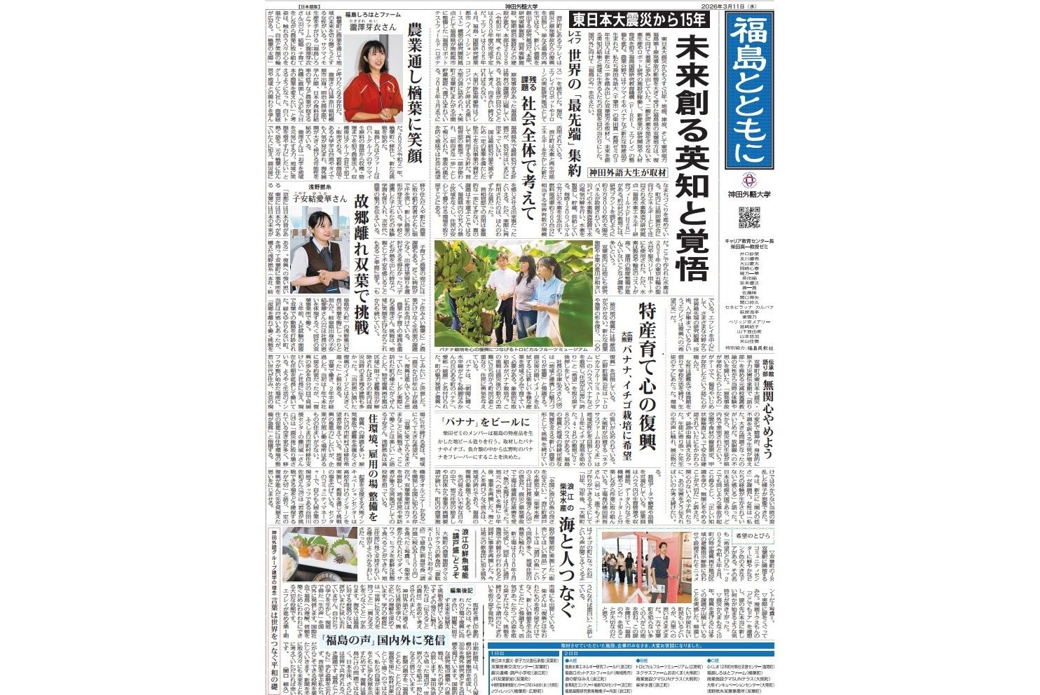 瀬戸復興副大臣は、令和8年3月4日(水)に神田外語大学の学生から『震災復興新聞』(日本語版:「福島とともに」、英語版:「Together with FUKUSHIMA」)の贈呈を受けました。『震災復興新聞』は、神田外語大学の学生が福島民報社の協力を得て、福島県浜通りの事業者等を取材して作成した新聞で、福島県知事にも贈呈されています。