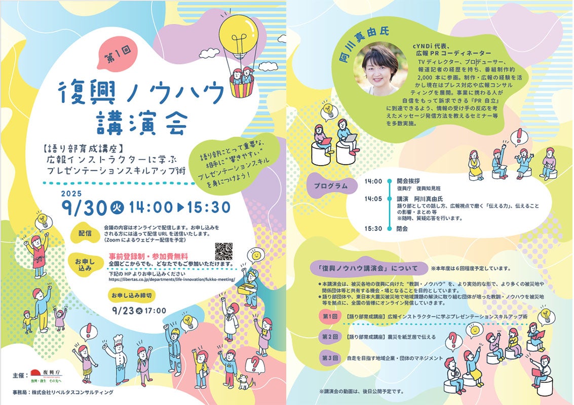 そのため、復興庁は、被災3県で蓄積されてきた事例や、語り部育成のノウハウの紹介の場として、今年度「復興ノウハウ講演会」を開催します。