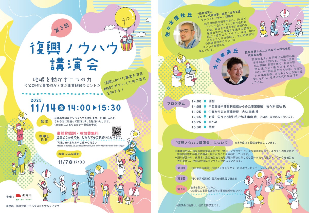 令和7年度 「新しい東北」復興ノウハウ講演会 開催のお知らせ~ (第3回) 地域を動かす二つの力 <公共性と事業性から学ぶ事業継続のヒント> ~